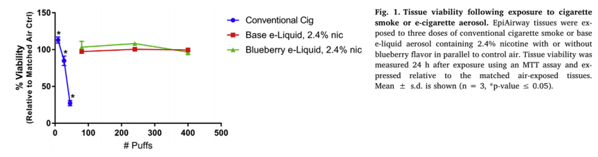 圖注:細胞活性随著(zhe)抽吸口數(s ≈hù)的(de)變化(huà)。藍(lán)線代表接觸香煙(yān)®•♦的(de)細胞,綠(lǜ)線代表接觸藍(lán)莓味電(di§<®àn)子(zǐ)煙(yān)的(de)細胞,紅(h<™óng)線代表接觸基礎口味電(diàn)子(zǐ)煙(y₹λπ&ān)的(de)細胞。